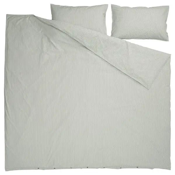 SOLFIBBLA duvet cover set is made from soft 100% cotton with clear, timeless green and white yarn-dyed stripes. The thicker yarn adds a cosy, handcrafted vibe with a hint of vintage charm to your bedroom.