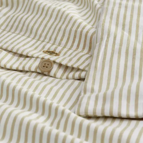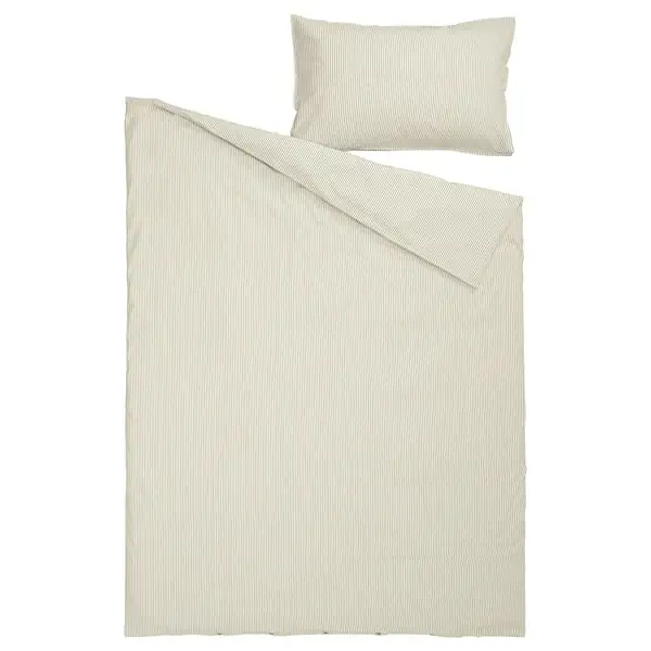 SOLFIBBLA duvet cover set is made from soft 100% cotton with clear, timeless beige and white yarn-dyed stripes. The thicker yarn adds a cosy, handcrafted vibe with a hint of vintage charm to your bedroom.