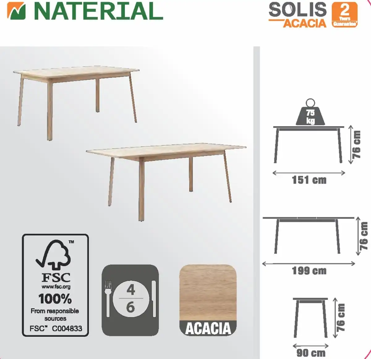 Tavolo da giardino allungabile rettangolare Solis NATERIAL con piano in legno L 150 x P 90 cmPer 4/6 persone, adatto ad ambienti di medie e grandi dimensioni come giardini, verande e terrazzeL'olio di finitura lascia al legno il suo aspetto biondo naturale. L'etichetta FSC permette di fare una scelta consapevole per prodotti che sono ottenuti da una gestione dei boschi ecologicamente appropriataViti ed istruzioni incluse, per un facile montaggioAbbinabile alle sedie della stessa serie.