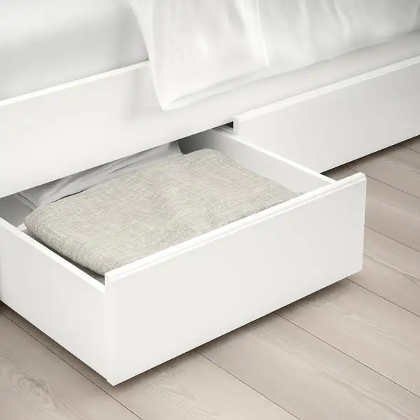 A sturdy bed frame with soft, profile edges and high legs. A classic shape that will last for many years. Also, there are spacious storage boxes under the bed where you can store bedding or clothes.