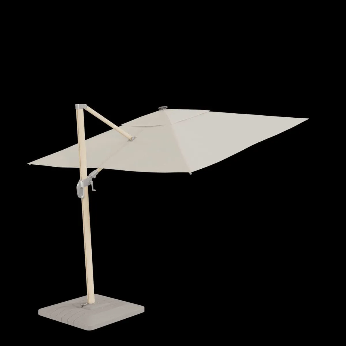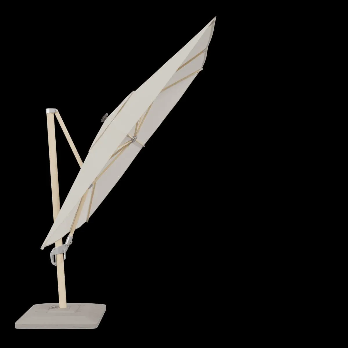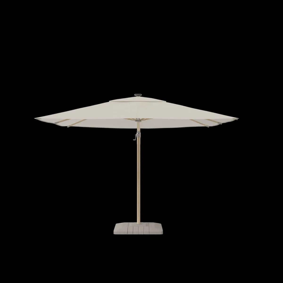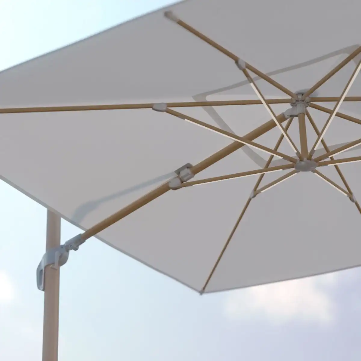 Sonora NATERIAL 290 x 290 cm off-center pole umbrella with white canvasIdeal for contract furniture: sturdiness and strength make it suitable for intensive use in bars, restaurants and other commercial activities, as well as in gardens and terraces for private use Solar-powered LED light recharges during the day and turns on at dusk for greater comfort and savings on consumption - Easy opening and closing thanks to the practical side crank - The side arm allows the umbrella to be tilted according to the position of the sun, providing plenty of shade and fully covering the desired area. At the same time, it does not clutter up too much space and does not get in the way of outdoor spaces - The canvas is thick and water-repellent, resisting rain, moisture and blocking 100 percent of UV rays Suitable for placement even in coastal areas thanks to the saltwater-resistant material.The frame is rust and weather resistant and, together with the possibility of replacing the canvas, ensures a long life of the umbrella. In addition, the wood effect gives a beautiful natural look by taking advantage of the strength properties of aluminum