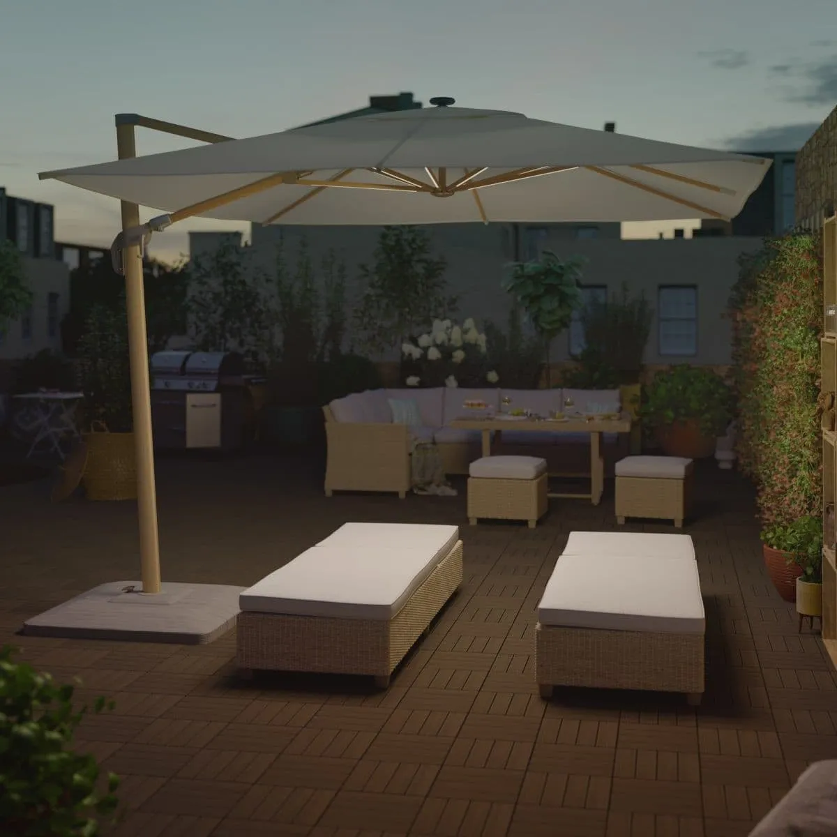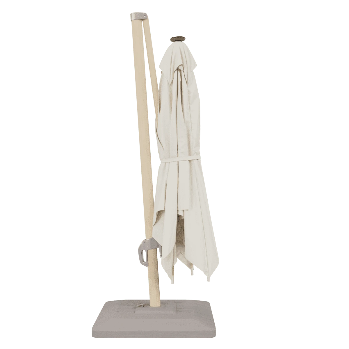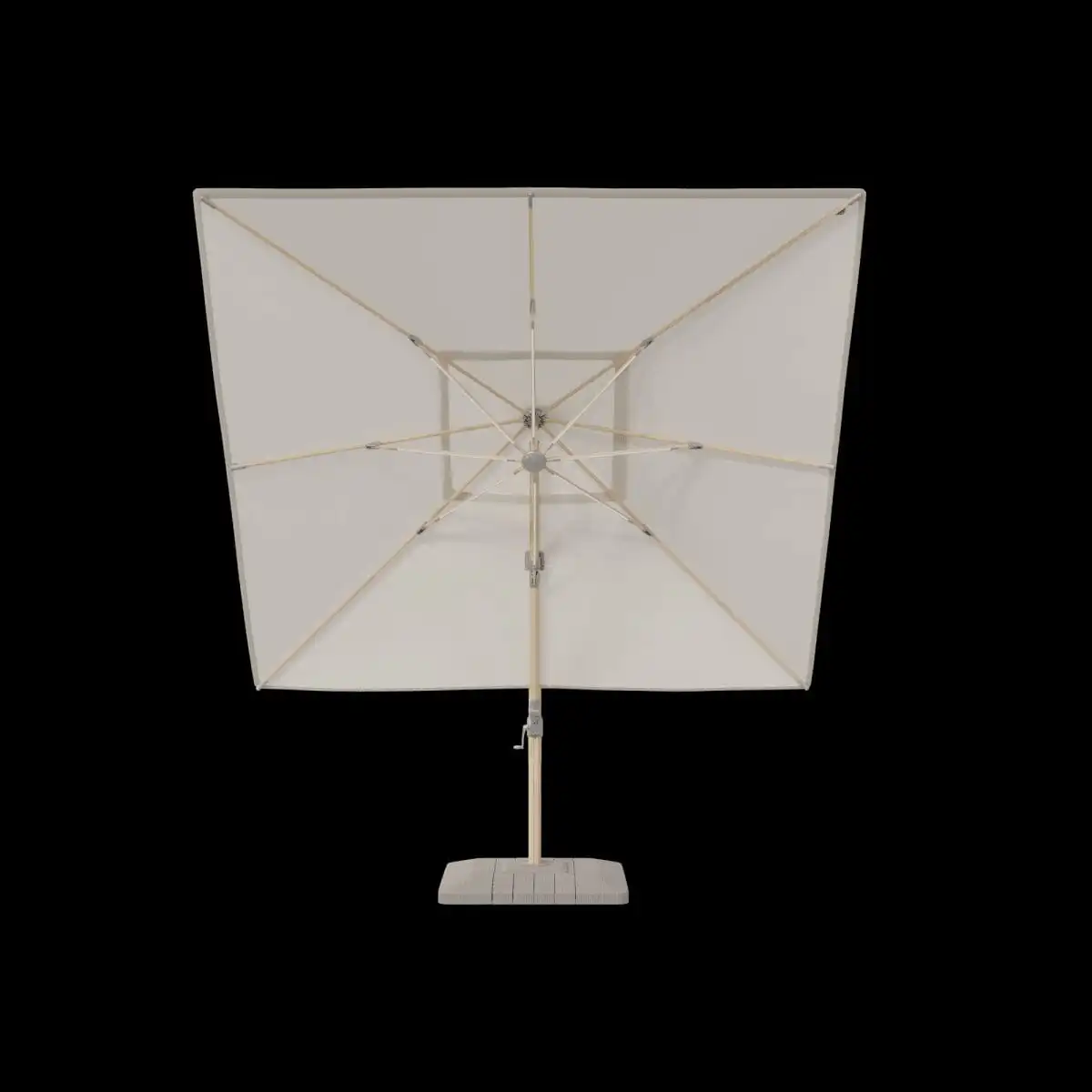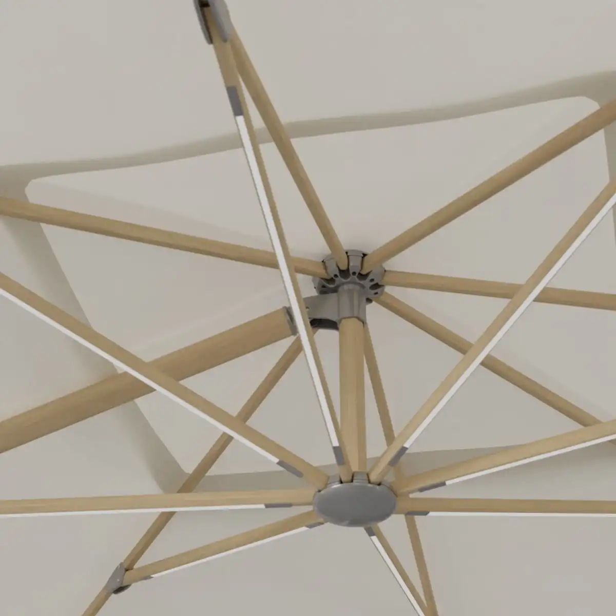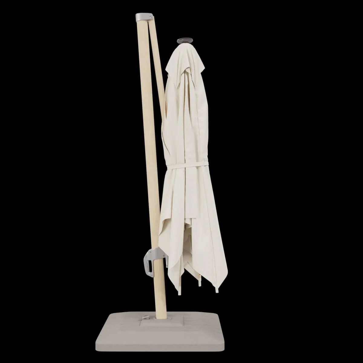 Sonora NATERIAL 290 x 290 cm off-center pole umbrella with white canvasIdeal for contract furniture: sturdiness and strength make it suitable for intensive use in bars, restaurants and other commercial activities, as well as in gardens and terraces for private use Solar-powered LED light recharges during the day and turns on at dusk for greater comfort and savings on consumption - Easy opening and closing thanks to the practical side crank - The side arm allows the umbrella to be tilted according to the position of the sun, providing plenty of shade and fully covering the desired area. At the same time, it does not clutter up too much space and does not get in the way of outdoor spaces - The canvas is thick and water-repellent, resisting rain, moisture and blocking 100 percent of UV rays Suitable for placement even in coastal areas thanks to the saltwater-resistant material.The frame is rust and weather resistant and, together with the possibility of replacing the canvas, ensures a long life of the umbrella. In addition, the wood effect gives a beautiful natural look by taking advantage of the strength properties of aluminum