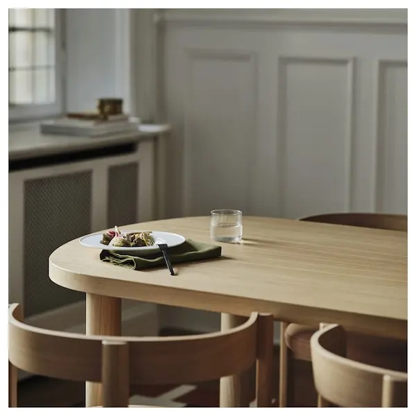 This oval dining table combines elegance, durability and easy assembly. Made of high-quality oak veneer with clear acrylic lacquer for a stunning, long-lasting centrepiece that caters to any dining space.