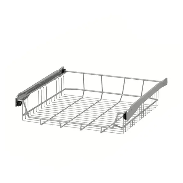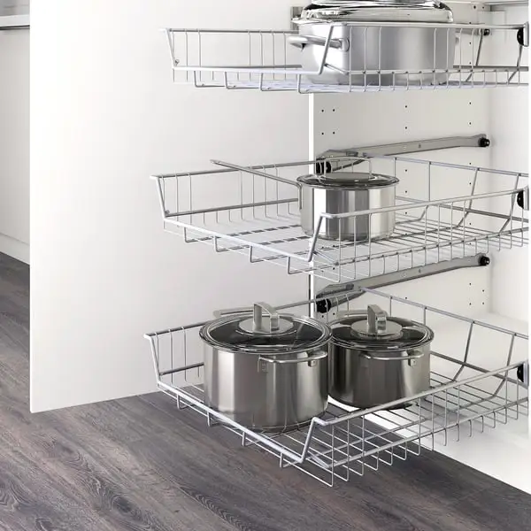 The beauty of this wire basket is that you see what’s inside, even higher up in a cabinet. Practical for textiles since air can circulate – and great for pots or pans because you won’t get ugly marks.
