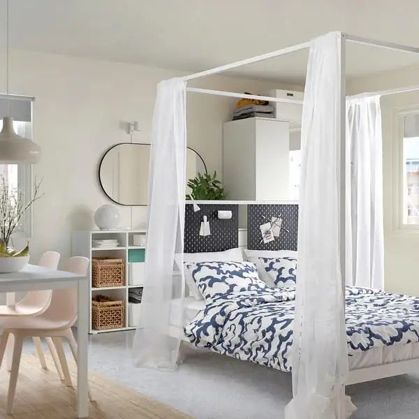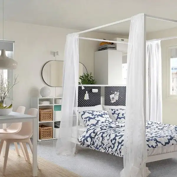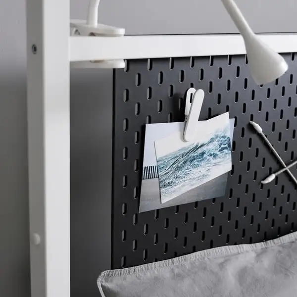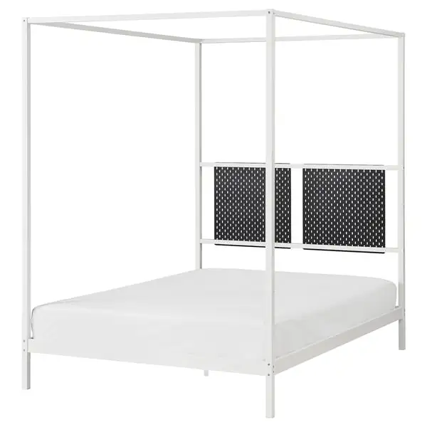 With VITARNA four-poster bed, you can create a cosy space for both sleeping and resting. This combination with SKÅDIS pegboards screens off and makes it easy to add more functions with accessories.