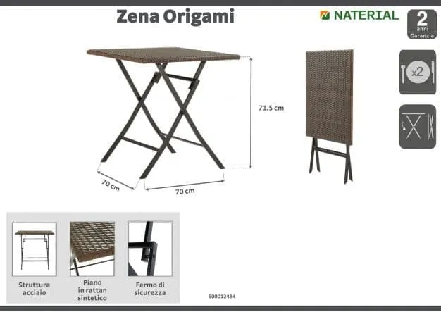 TABLE ZENA ORIGAMI 70X70 FOLDING MIDOLLINO SYNTHETIC AND STEEL TABLEFor 2 people, suitable for small and medium-sized environments such as balconies, verandas, terraces, gazebos and particular garden cornersEasy to cleanFoldable, to ensure maximum space saving when not in useAlready assembled.
