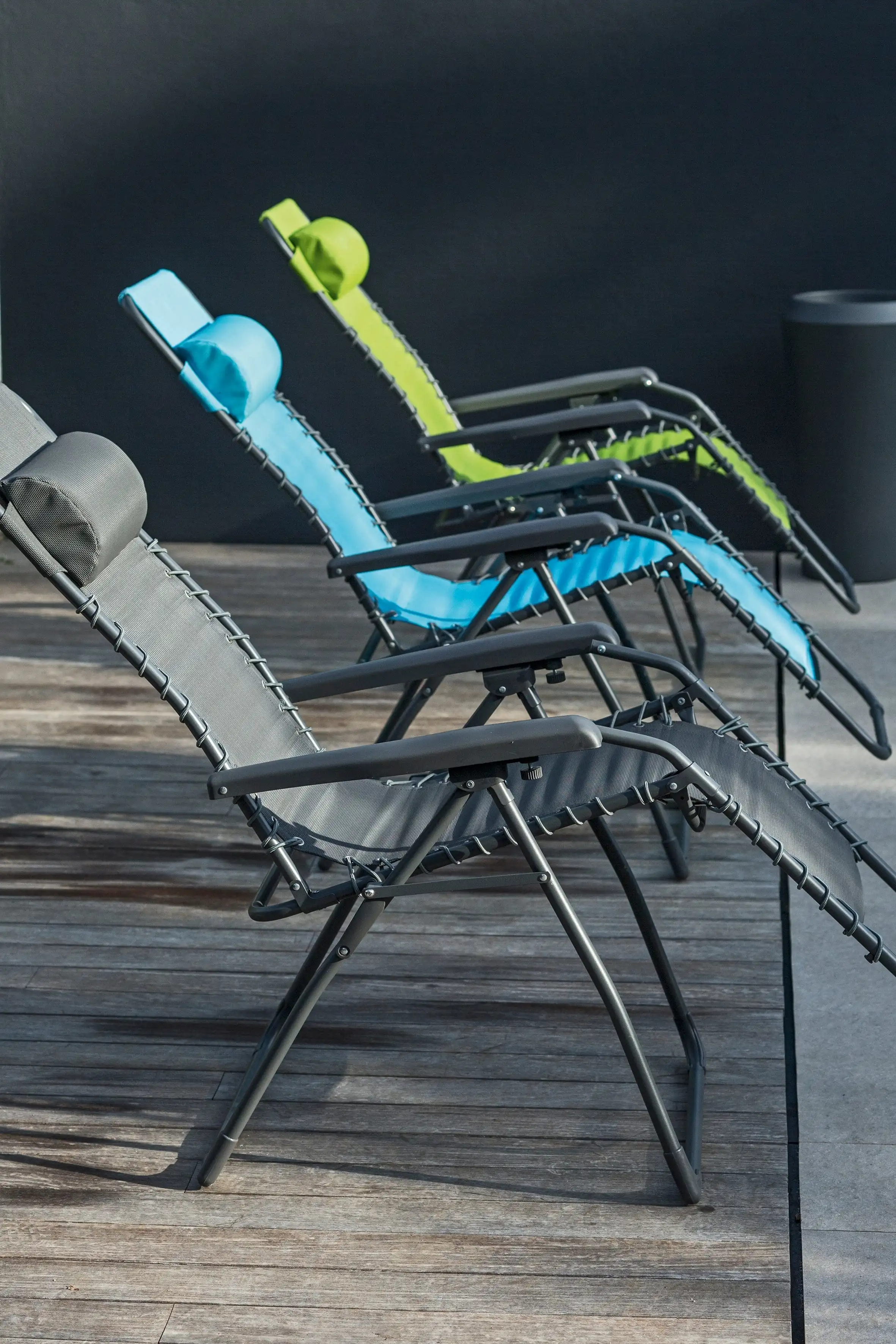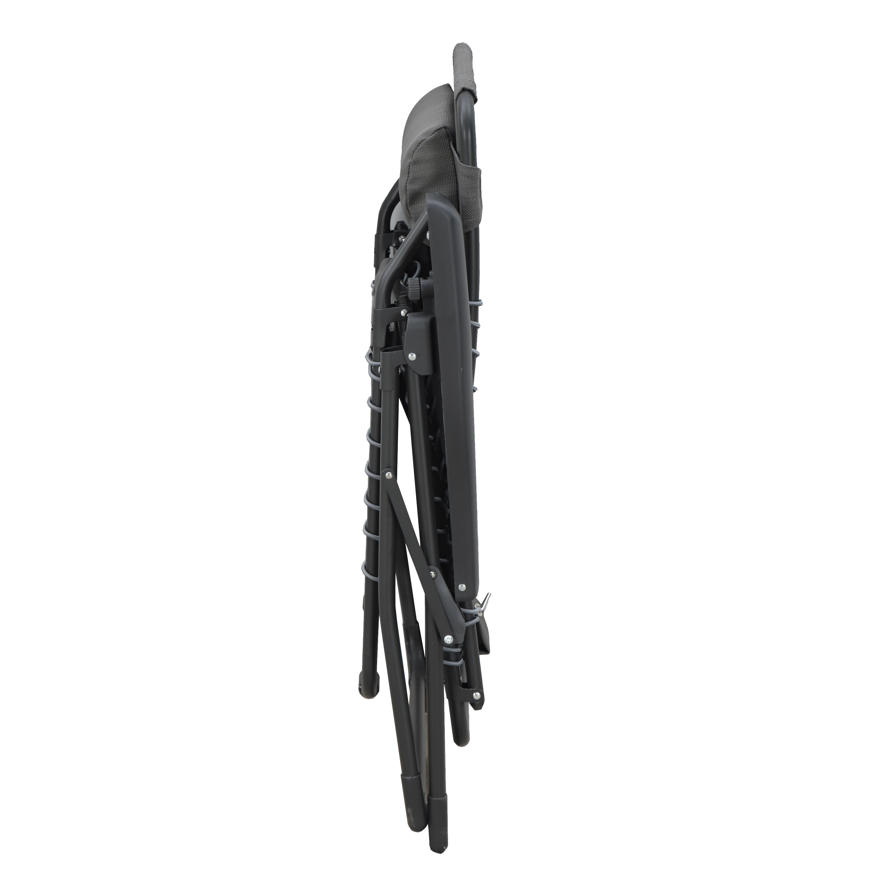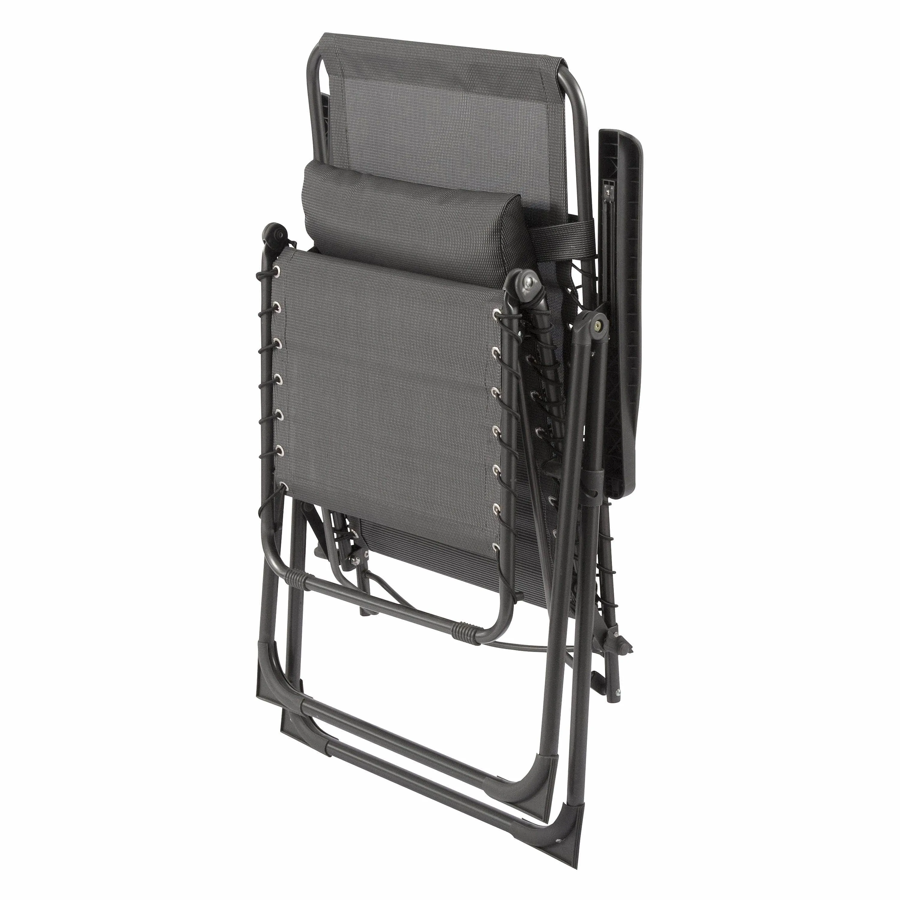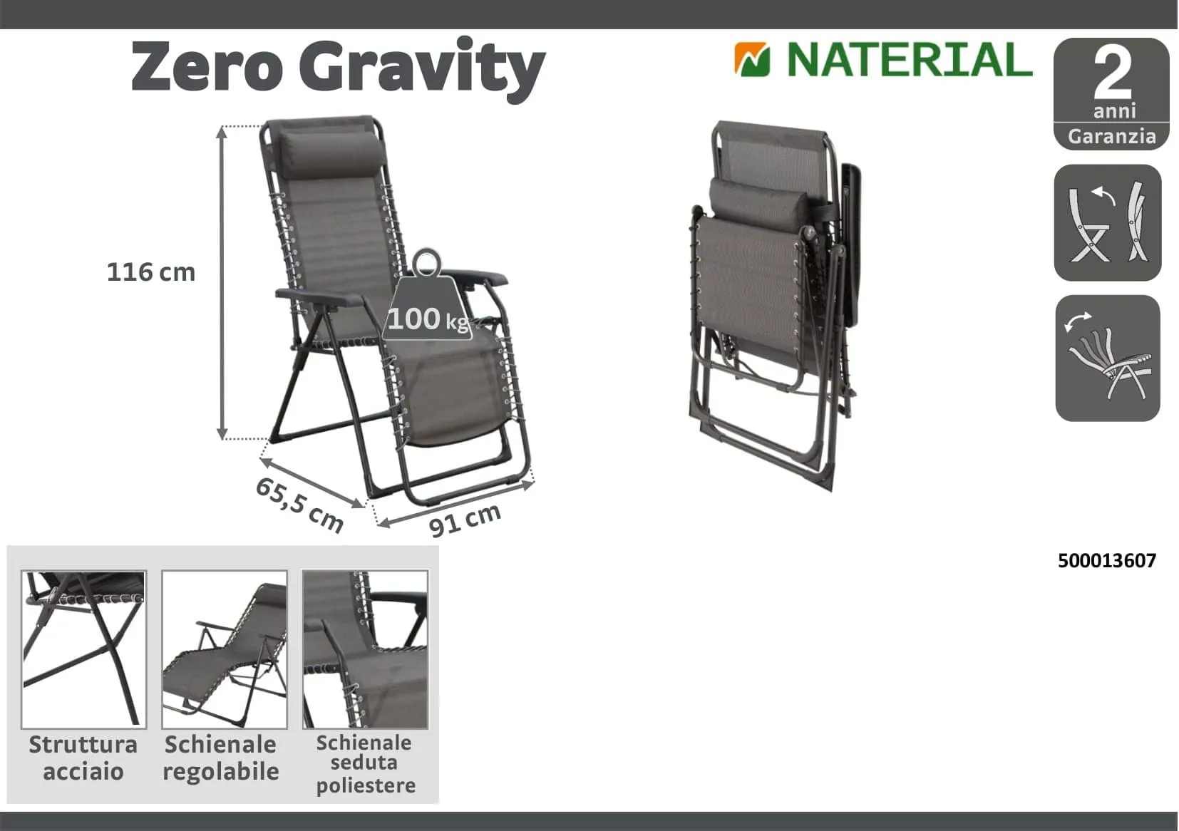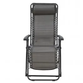 ZERO GRAVITY STEEL-TEXT MULTIPOSITION RELAX CHAIR WITH LIGHT GRAY CUSHIONThe ZERO GRAVITY relaxation chair can be easily placed on a small patio, in a garden or on a terrace, with multiple positions for the backrest and legs. Easy to fold and transport, the frame is made of powder-coated steel.