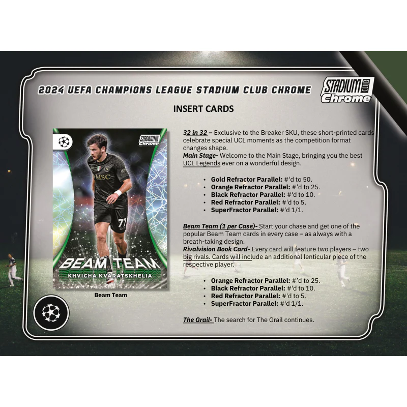 The 2023/24 Topps Stadium Club Chrome UEFA Soccer Breaker’s Delight Box is tailored for fans and collectors who crave the thrill of breaking packs filled with soccer's elite talent. This premium set features high-gloss, full-bleed photography that captures the intensity of UEFA’s top players in action, bringing the game to life like never before. Each box includes an array of exclusive Chrome parallels, autographs, and inserts, showcasing both established stars and rising talents from Europe’s premier clubs. With stunning visuals and a mix of rare pulls, Breaker’s Delight is a must-have for any UEFA fan looking to elevate their collection with Topps' signature Chrome style.