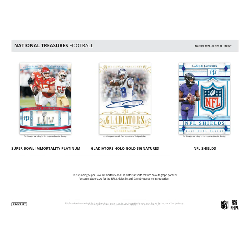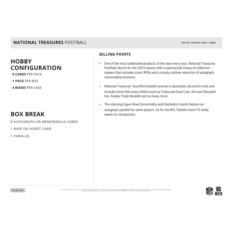 - One of the most celebrated products of every year, National Treasures Football returns for the 2023 season with a spectacular lineup of collection-makers that includes iconic RPAs and a simply sublime selection of autograph-memorabilia stunners.