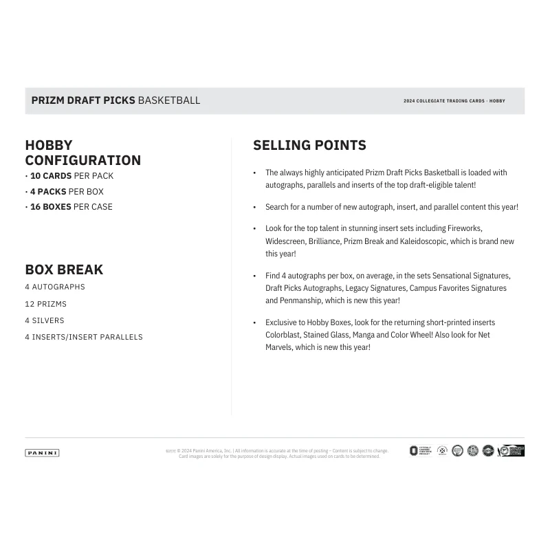 The 2024/25 Panini Prizm Draft Picks Collegiate Basketball Hobby Box captures the excitement of college basketball with a bold collection of cards featuring top draft prospects and star NCAA players. Known for its vibrant Prizm parallels and sleek designs, each box includes a mix of base cards, colorful parallels, and on-card autographs that highlight the future stars of the NBA. Collectors can hunt for rare inserts like Color Blast and Stained Glass, as well as a variety of numbered Prizms. Perfect for college basketball enthusiasts and collectors following rising talent, this box brings the thrill of the draft season to life.
